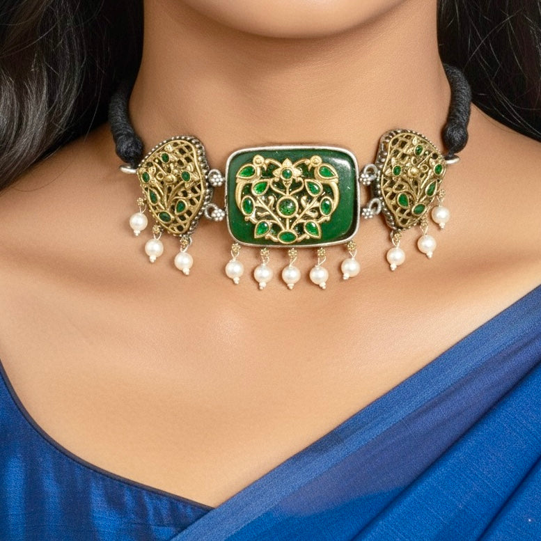 Paired with one-of-a-kind oxidised silver birdcage jhumka earrings, topped with deep green enamel and gold filigree, this set effortlessly blends heritage charm with contemporary elegance.