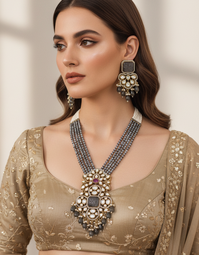 This Moissanite necklace set beautifully merges Rajasthani heritage with modern luxury. The deep black tones and intricate craftsmanship make it a standout choice for weddings, receptions, and grand celebrations.