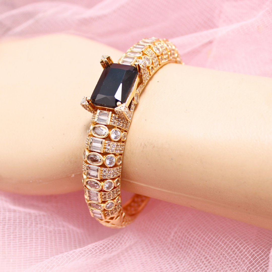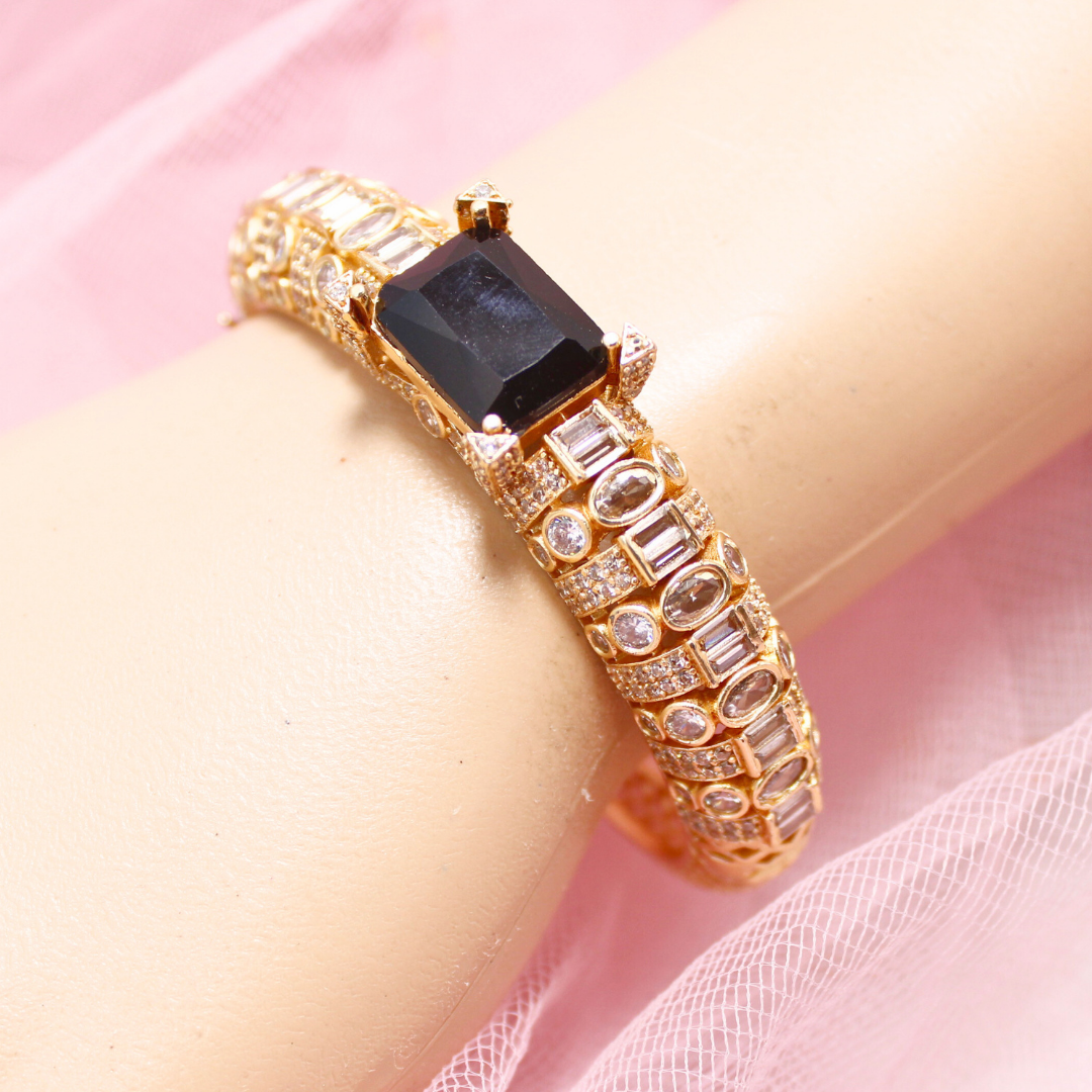 Turn heads with this luxury openable bracelet featuring a striking black gemstone centerpiece. Enhanced with shimmering zircon detailing on a rich gold-finish base, this bracelet brings unmatched elegance and versatility — perfect for both ethnic and western wear.