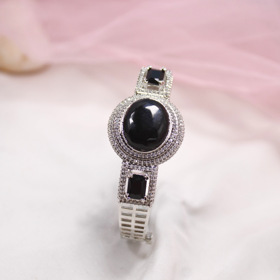 Add bold sophistication to your look with this handcrafted openable kada featuring a striking black round gemstone centerpiece. Surrounded by dazzling zircon detailing and finished in a premium silver tone, this bracelet is a true statement piece for weddings, parties, and special occasions.