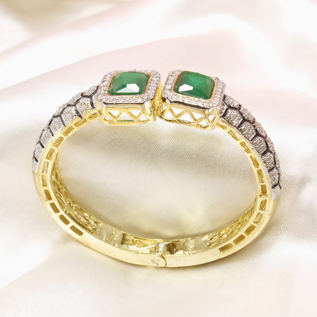Diamond Look Alike Bracelet Golden Polish-Green features green stones set in an antique gold finish—ideal for festivals, parties, ethnic celebrations.