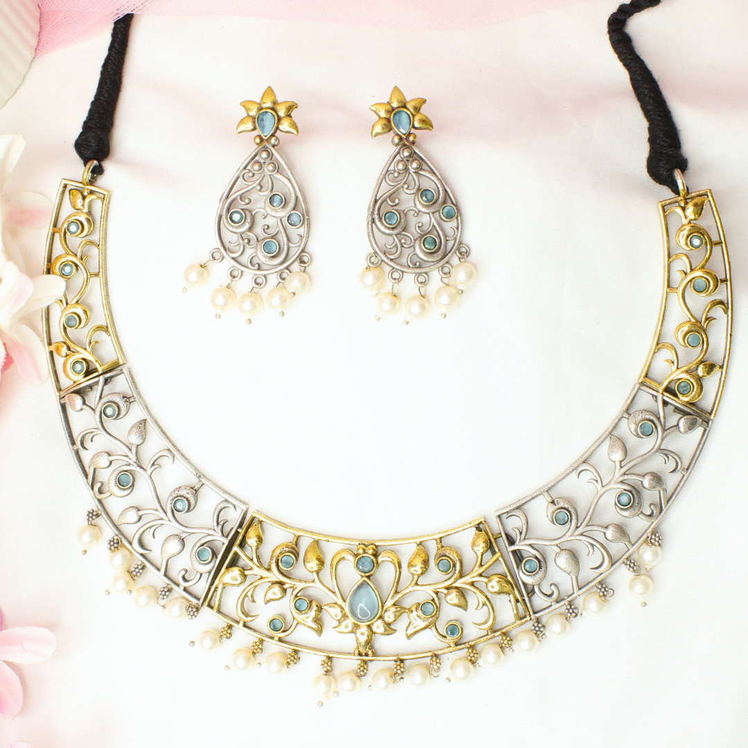Add Navraee’s Dual-Tone Cutwork Necklace Set to your collection today!<<
