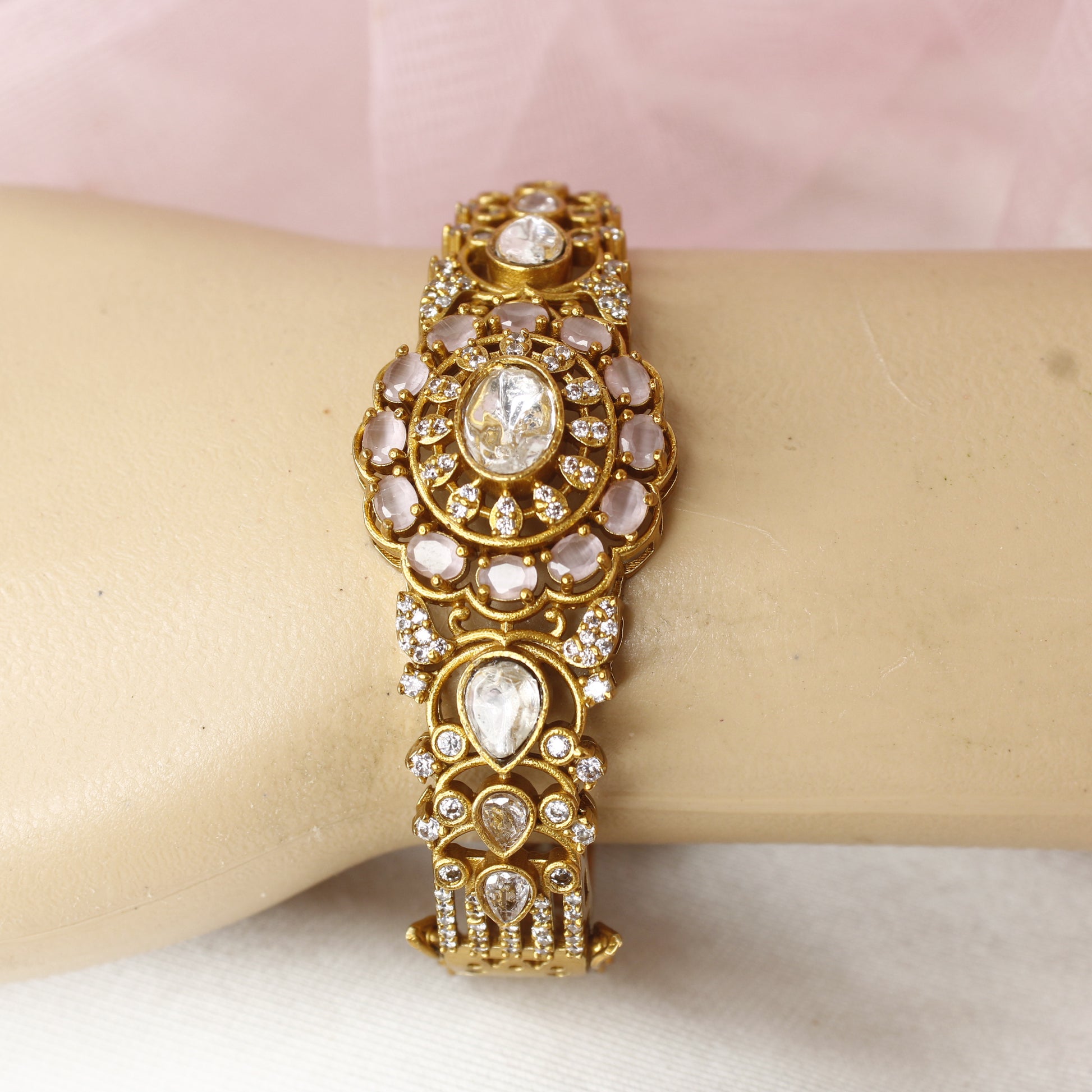 Discover a new realm of elegance with our stunning Antique Polki Kada. This exquisite bangle features a rich antique gold finish, centered with a magnificent floral motif of uncut polki and a delicate halo of soft, rose-pink stones. Offering a sophisticated and feminine twist on a classic design, this openable kada is perfect for modern brides, receptions, and elegant festive wear.