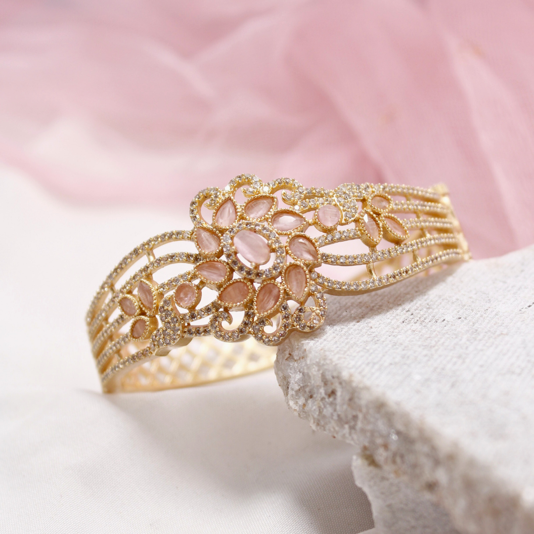 Embrace subtle sophistication with this handcrafted openable AD kada, designed in a floral motif with pastel pink stones and dazzling American Diamonds. Finished in premium gold plating, this bracelet blends femininity and elegance — perfect for festive and bridal looks.