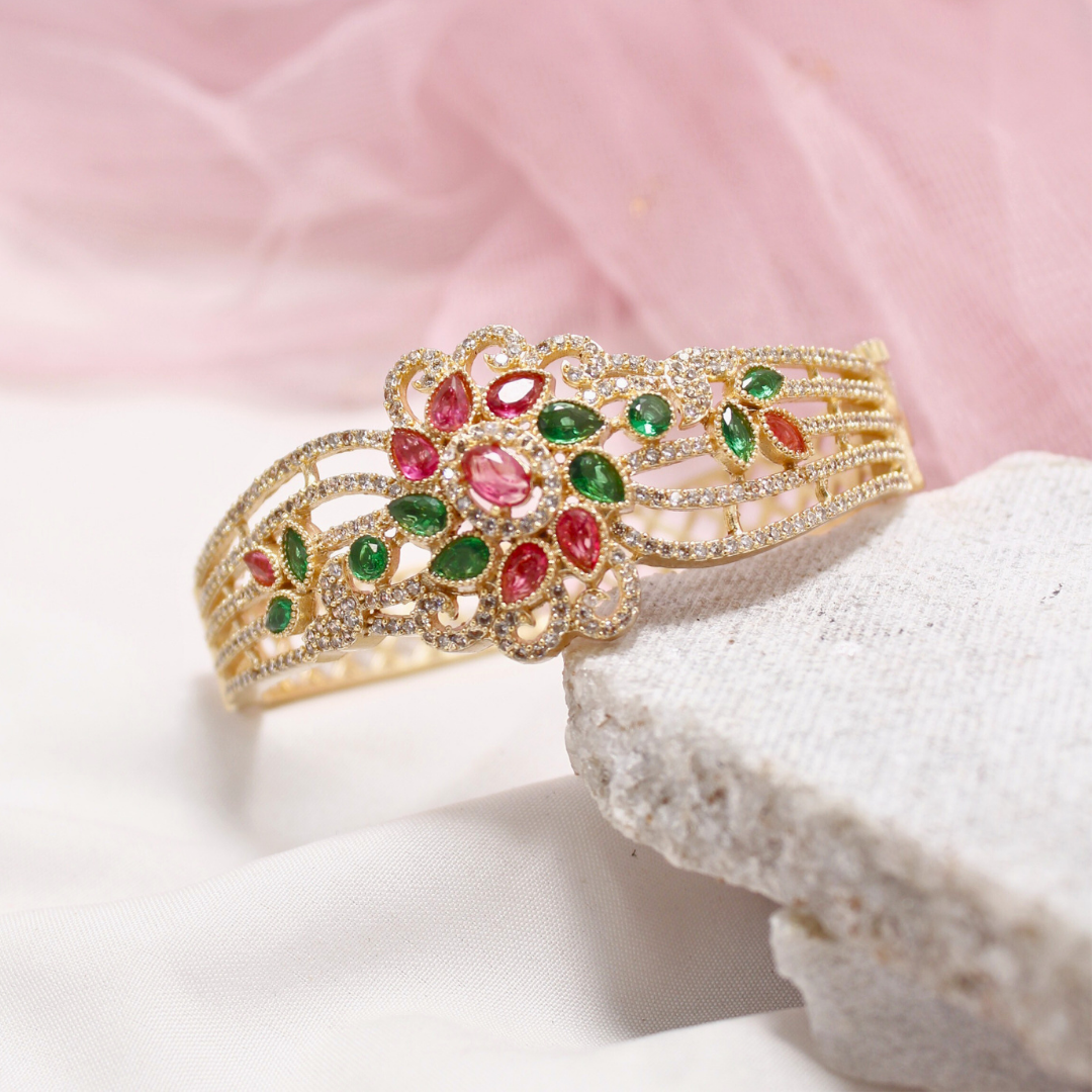 Red & Green Stone Floral AD Openable Kada – Gold Finish Bracelet