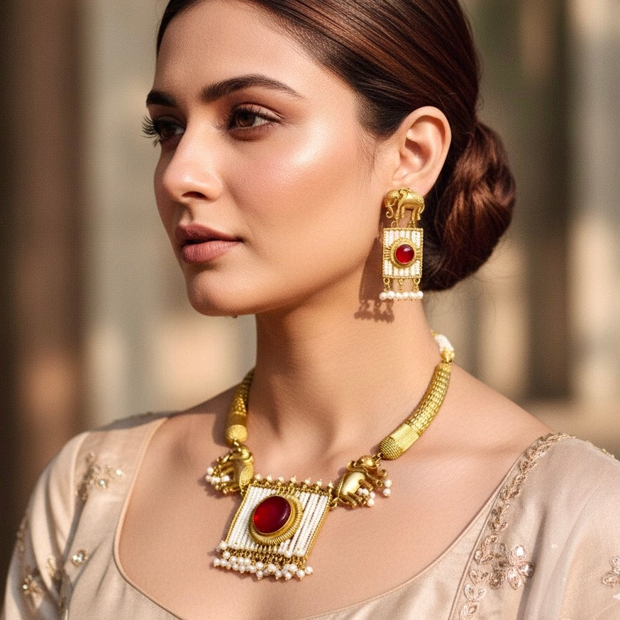 Gaj Pearl Necklace features stones set in an antique gold finish—ideal for festivals, parties, ethnic celebrations.