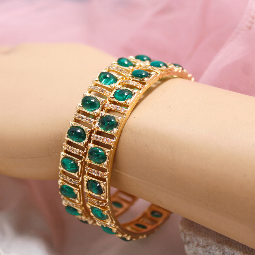 green zircon bangles, emerald stone bangles, gold plated AD bangles, festive bangles Navraee, green stone jewellery