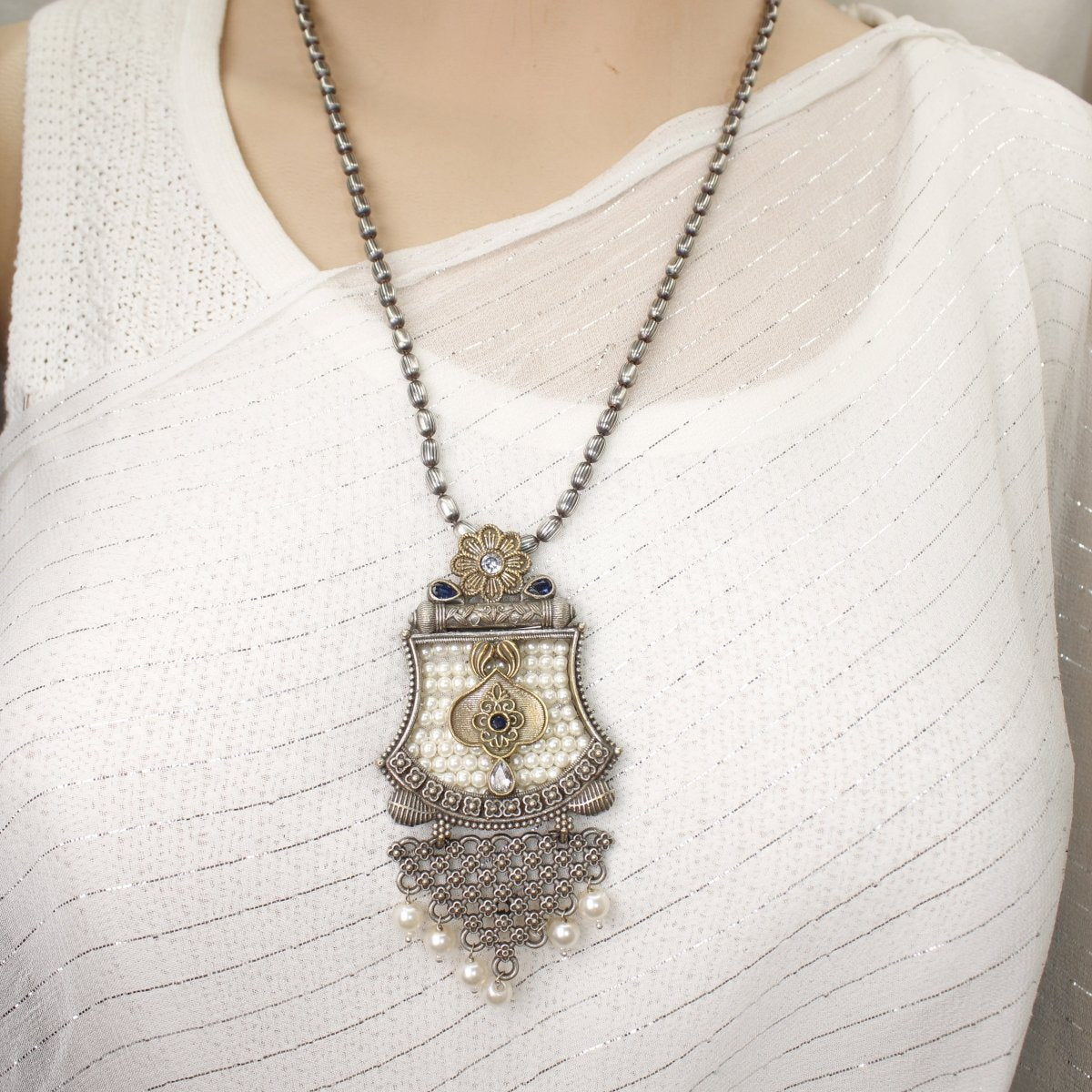 GULDASTA-DUAL-TONE PEARL JAALI ANTIQUE GOLDEN PENDANT SET-BLUE