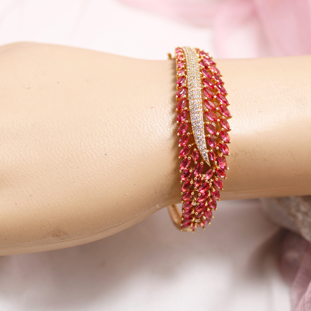 Ruby Red Leaf Design AD Openable Kada – Gold Finish Bracelet