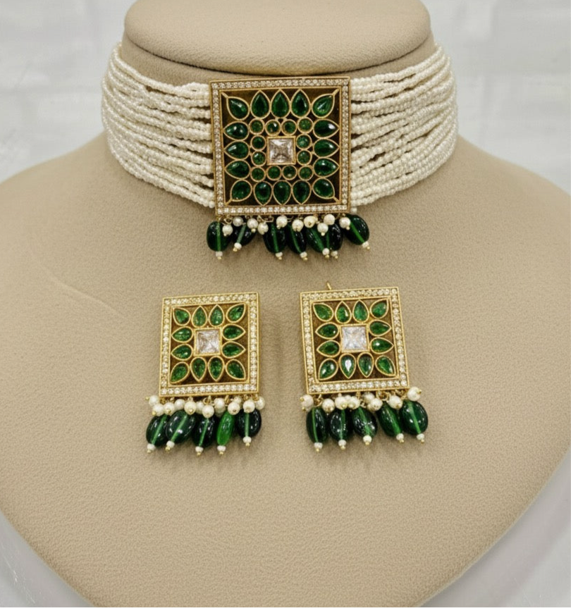 Mehreen Kundan Pearl Choker Set – Emerald Editi