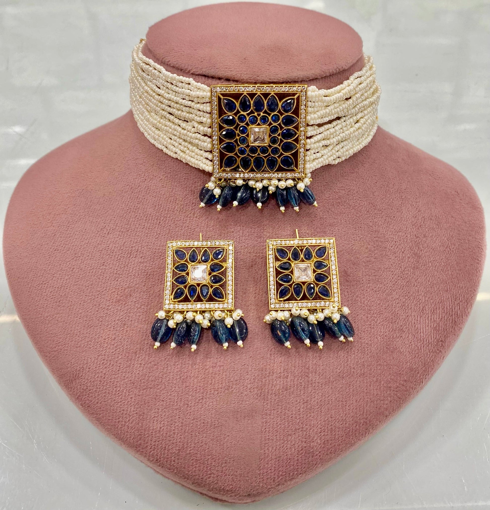 Step into royal heritage with our Mughal Jharokha Choker Set, where old-world charm meets bold design. The choker is centered around a square kundan panel, encrusted with navy blue sapphire-cut stones, teardrop and round motifs, and a radiant kundan centerpiece. Dangling navy beads and pearl drops bring movement and richness.