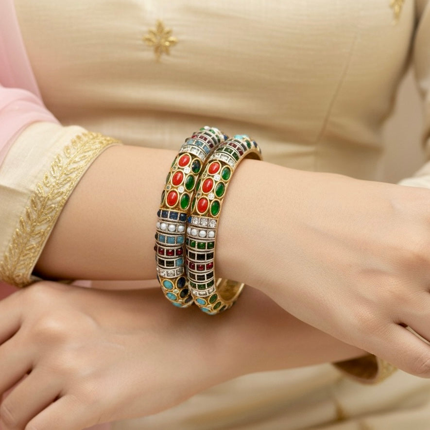 Navratan Nagina Bangles-Dual-Tone Finish-Set Of 2 features stones set in an antique gold finish—ideal for festivals, parties, ethnic celebrations.