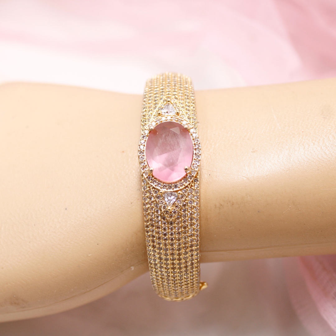 Add feminine elegance to your festive look with this handcrafted openable bracelet. Featuring an oval pink gemstone centerpiece, surrounded by sparkling zircon accents and a richly detailed gold-finish band, this kada blends royal artistry with modern grace.