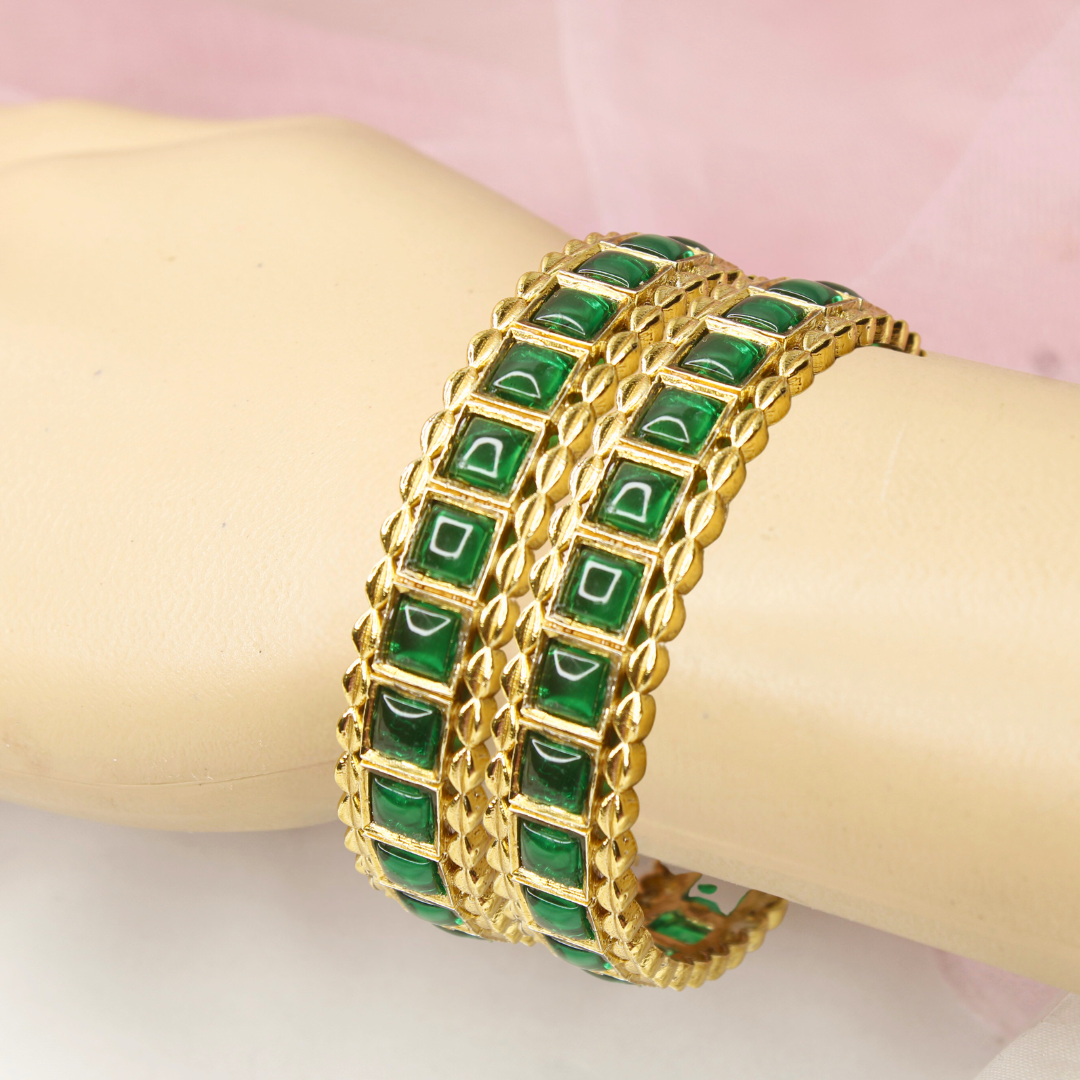 Green Square Stone Bangles Set of 2 – Gold Plated Traditional Bangles