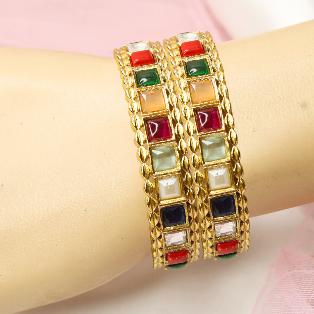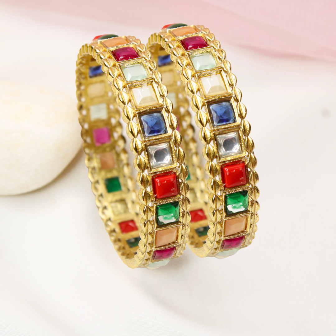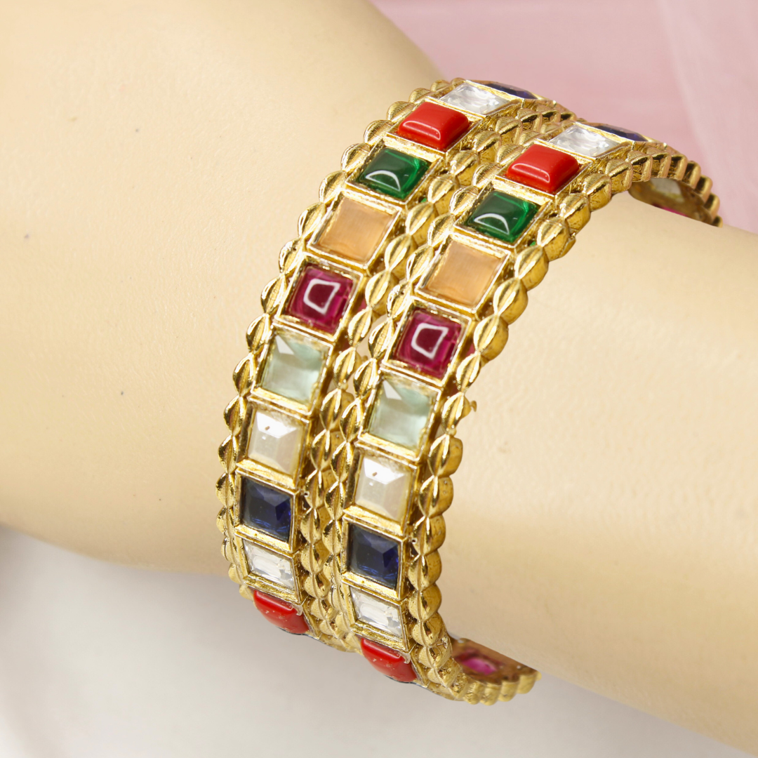 Add a pop of colour to your festive look with our Multicolour Square Stone Bangles Set of 2. Featuring vibrant stones in ruby red, emerald green, sapphire blue, pearl white, coral orange, and more, these bangles bring a playful yet royal charm. Finished in polished gold plating, they are the perfect pick for weddings, parties, and festivals.