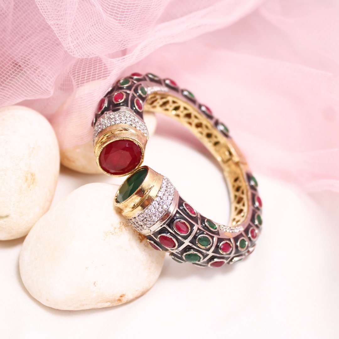 Rajwadi Stone & Meenakari Kada – Gold Plated Green & Red Openable Bangle