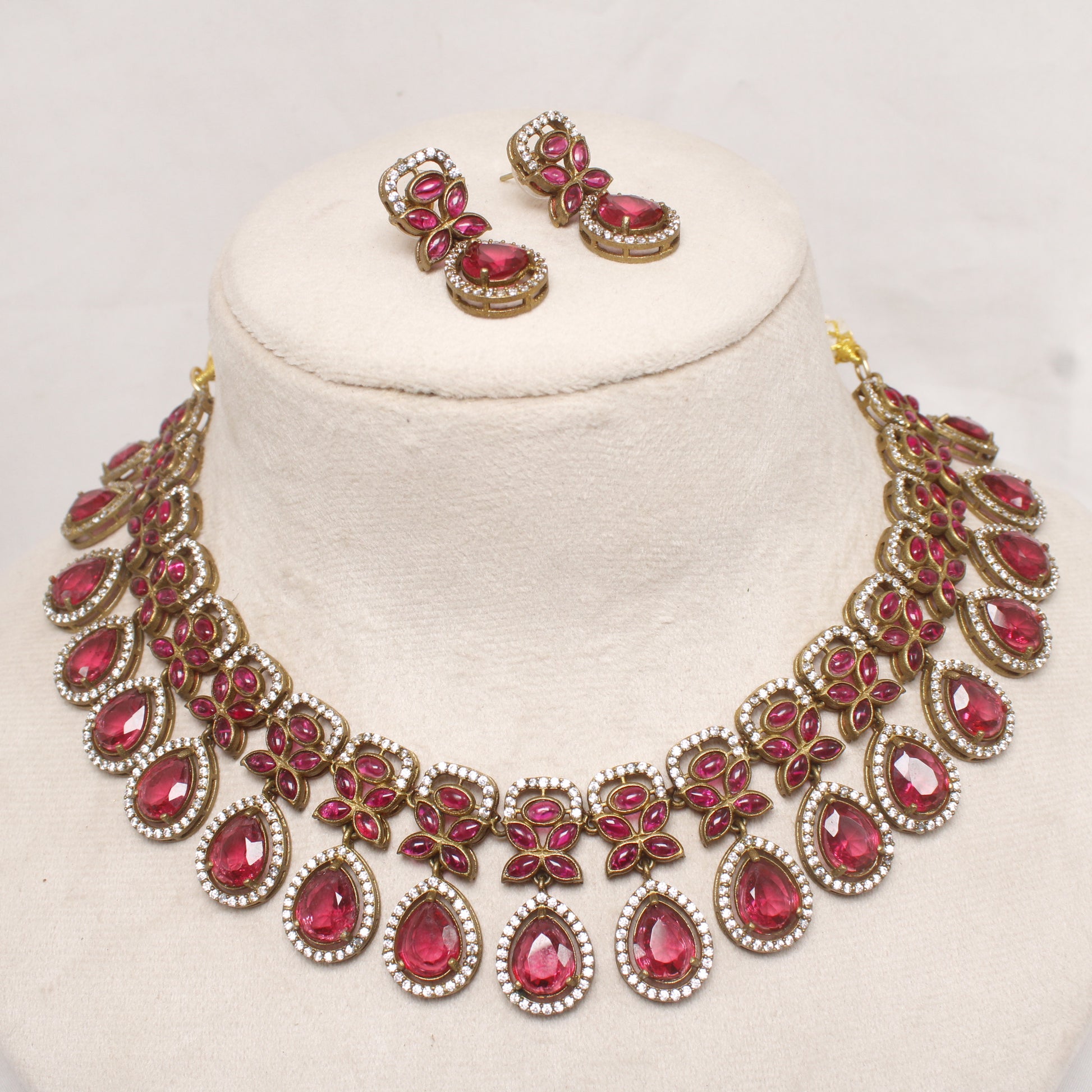 Each vibrant stone is framed by a delicate halo of shimmering American Diamonds that add a dazzling contrast. The entire piece is rendered in a beautiful antique gold-plated finish, lending it a timeless, heirloom quality. The matching earrings are equally splendid, echoing the necklace's floral and teardrop design to create a perfectly harmonious and unforgettable bridal look.