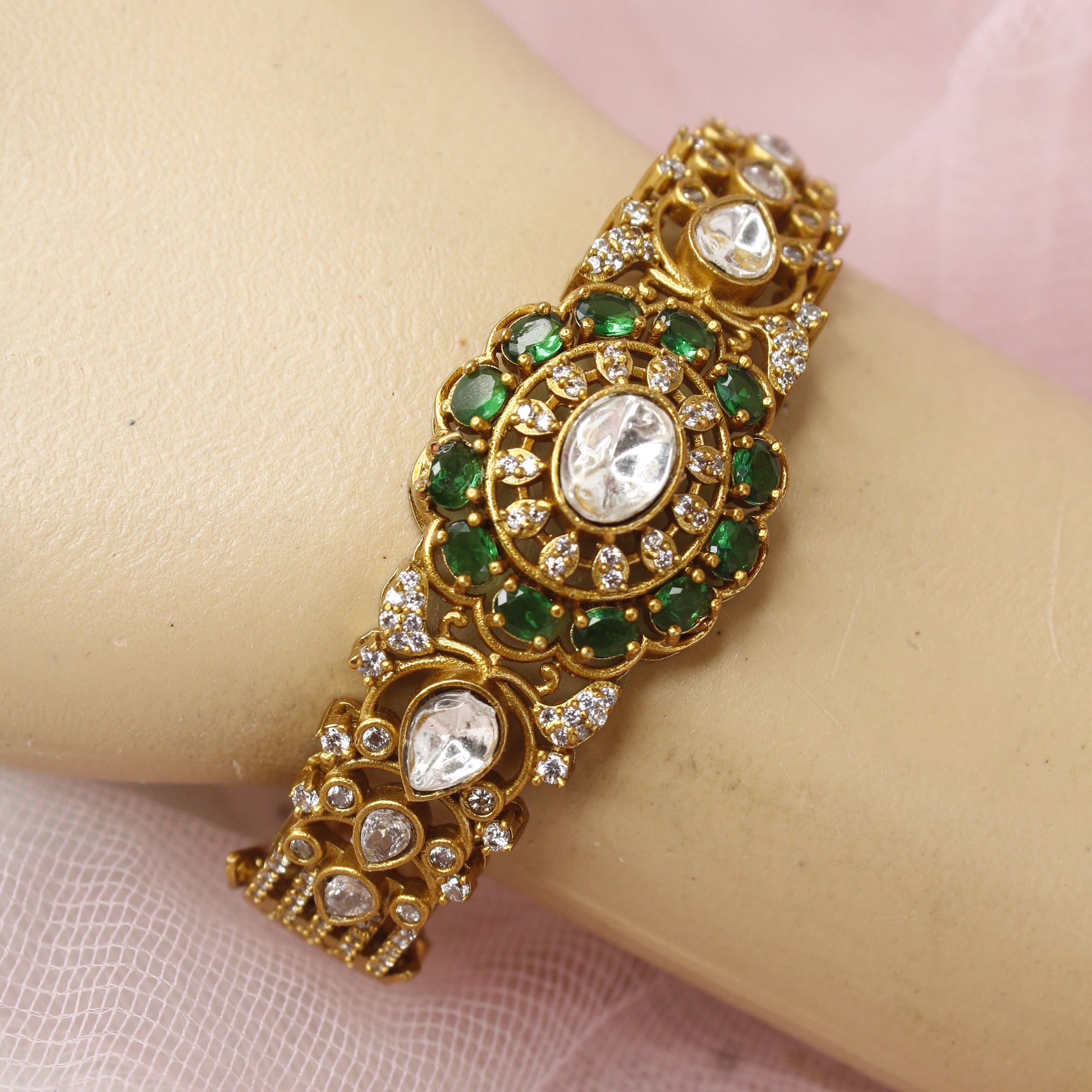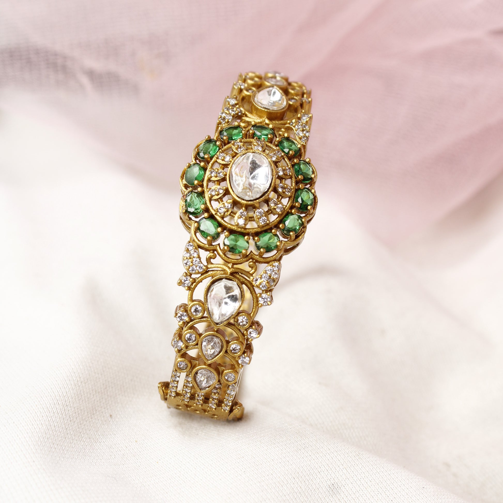 Embody the grace of a maharani with our breathtaking Antique Polki and Emerald Green Kada. This magnificent bangle features a rich antique gold finish, centered with a regal floral motif made of uncut polki and a halo of vibrant green stones. A masterpiece of traditional design, this openable kada is an essential accessory for brides and a showstopper for any grand celebration.