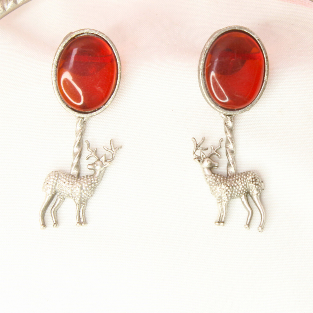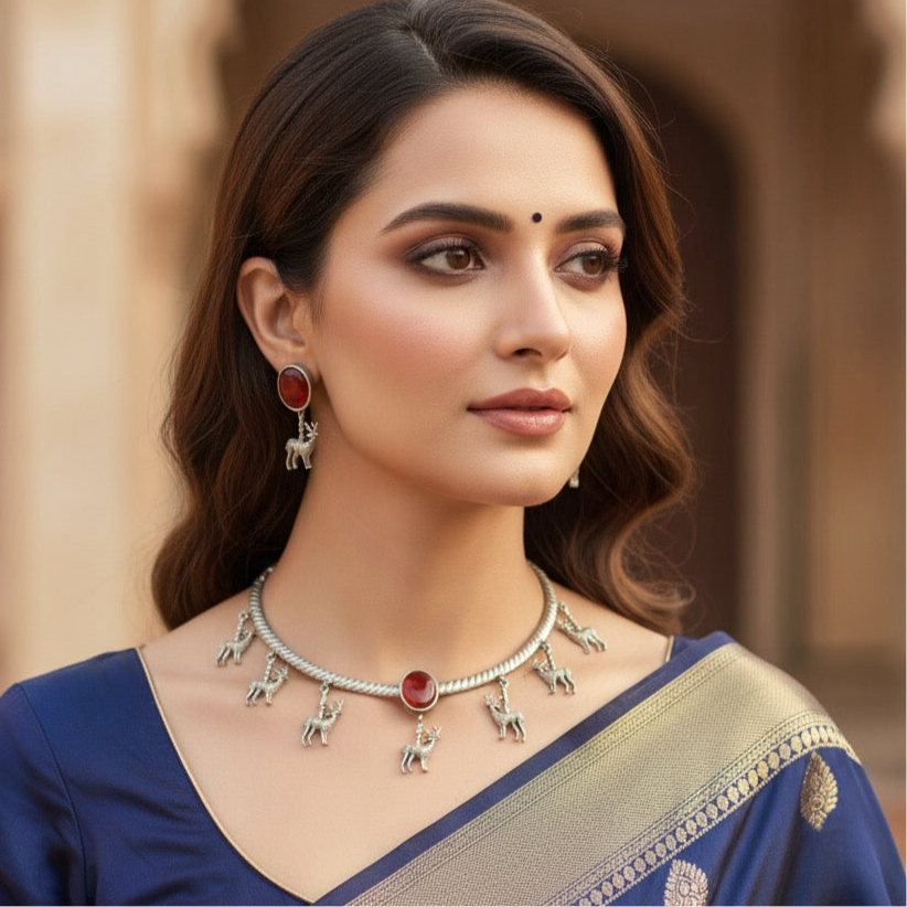 Silver Look Alike Deer Hasli-Red features red stones set in an antique gold finish—ideal for festivals, parties, ethnic celebrations.
