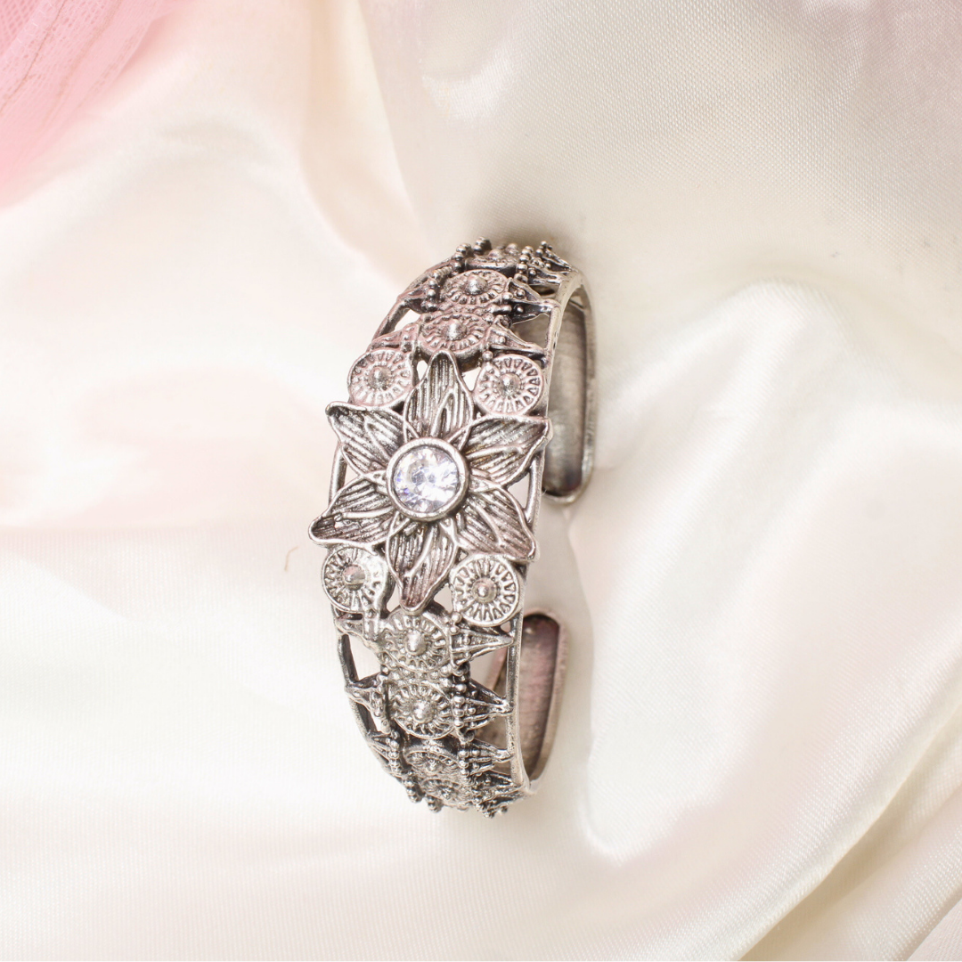 Silver Replica Karigari Cutwork Clasp Bracelet features stones set in an antique gold finish—ideal for festivals, parties, ethnic celebrations.